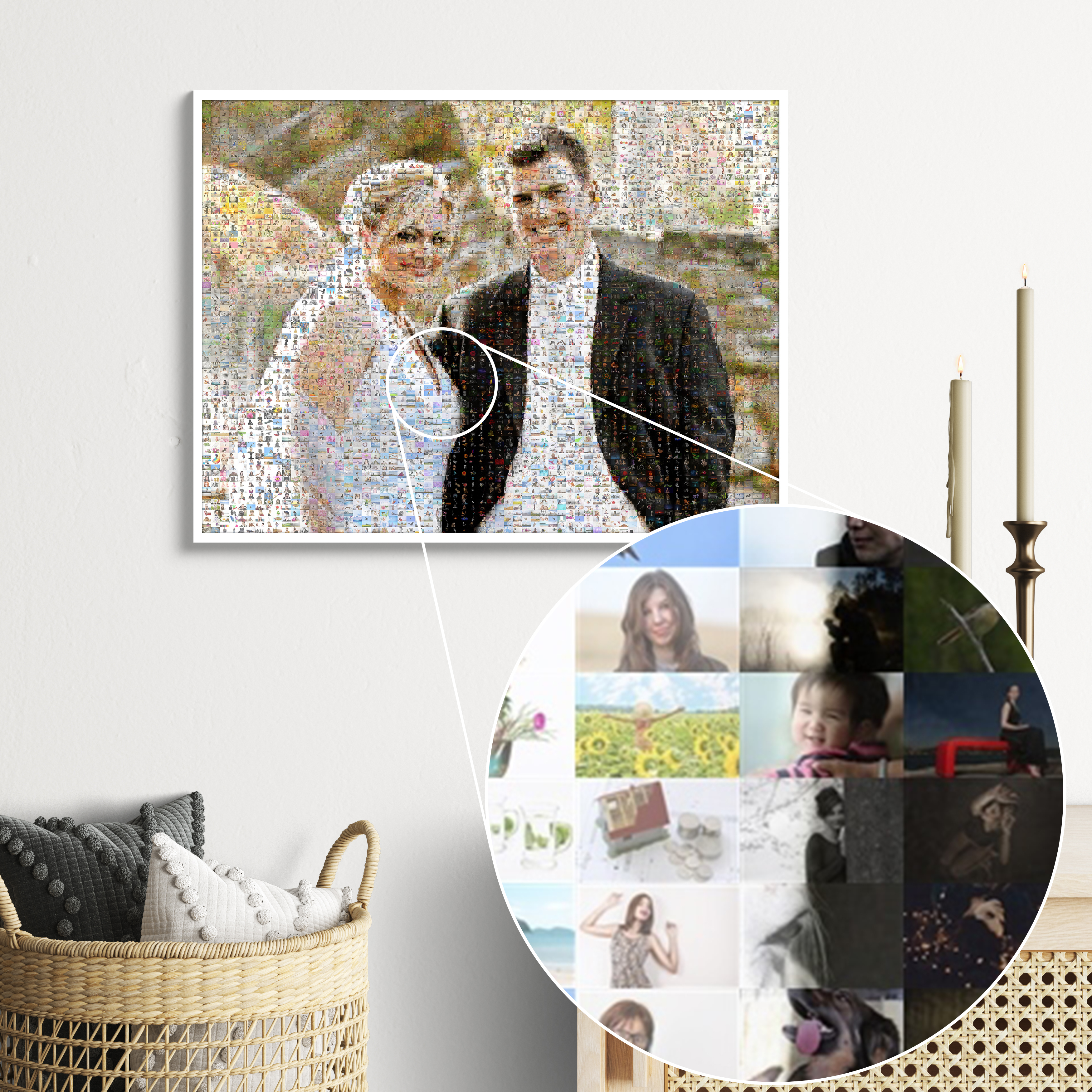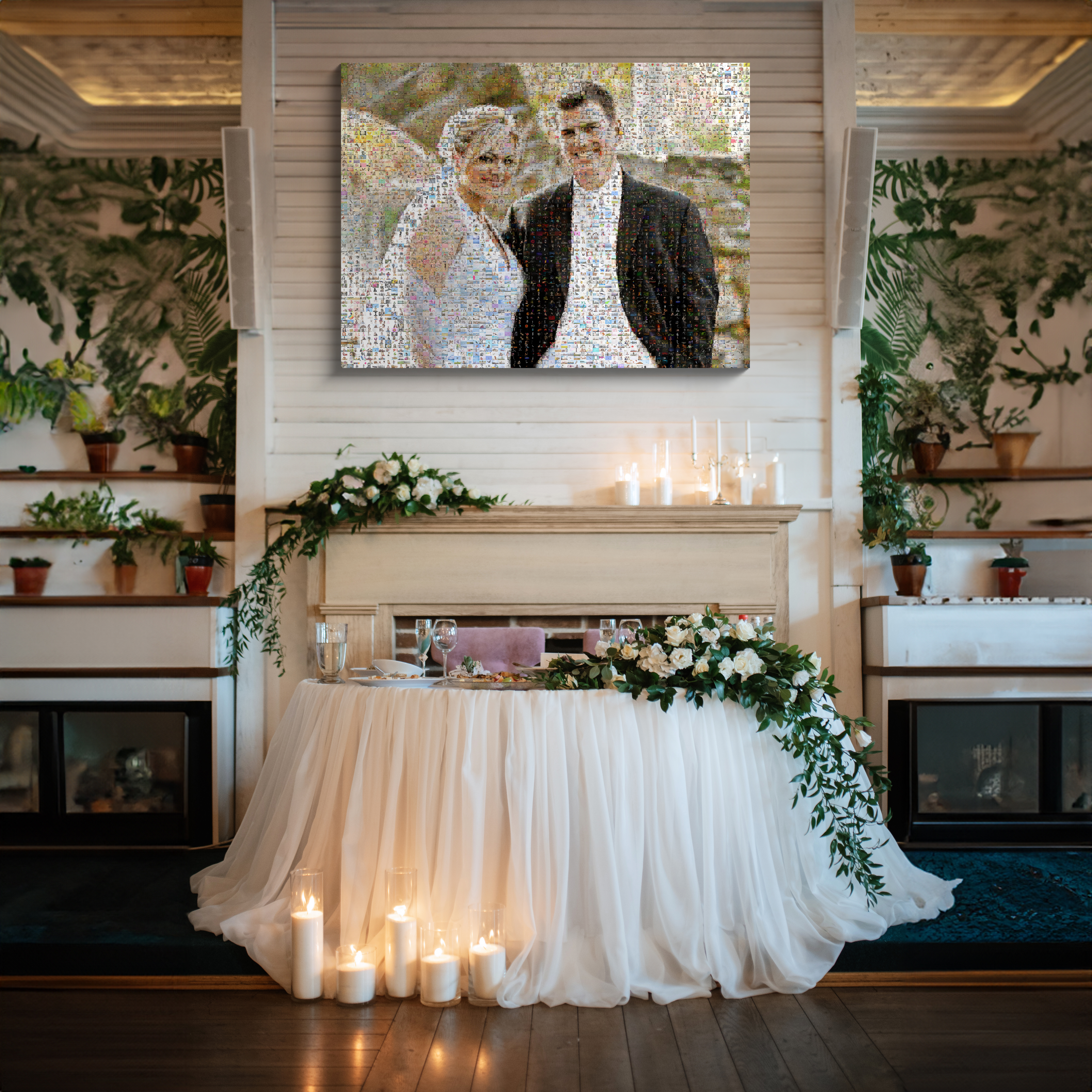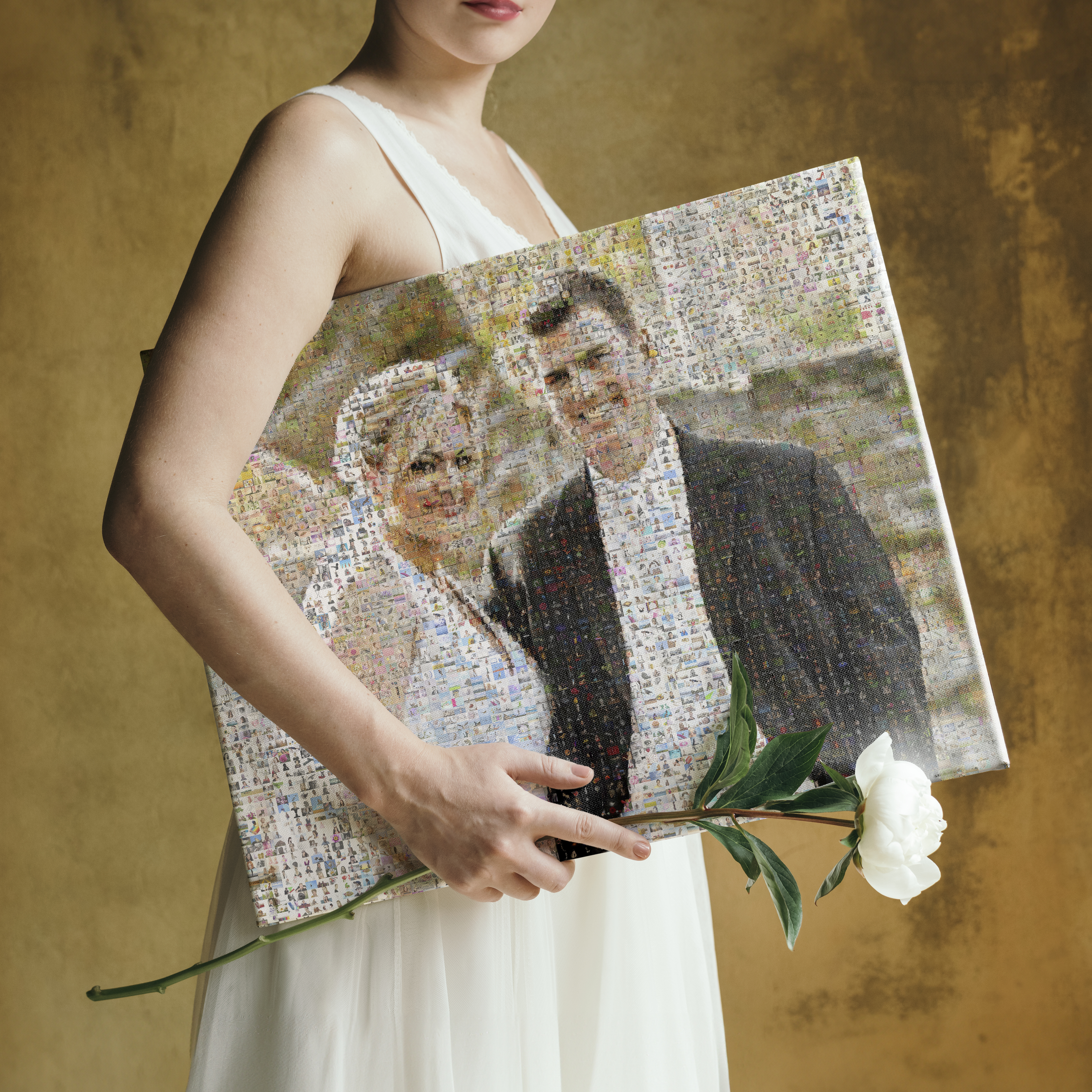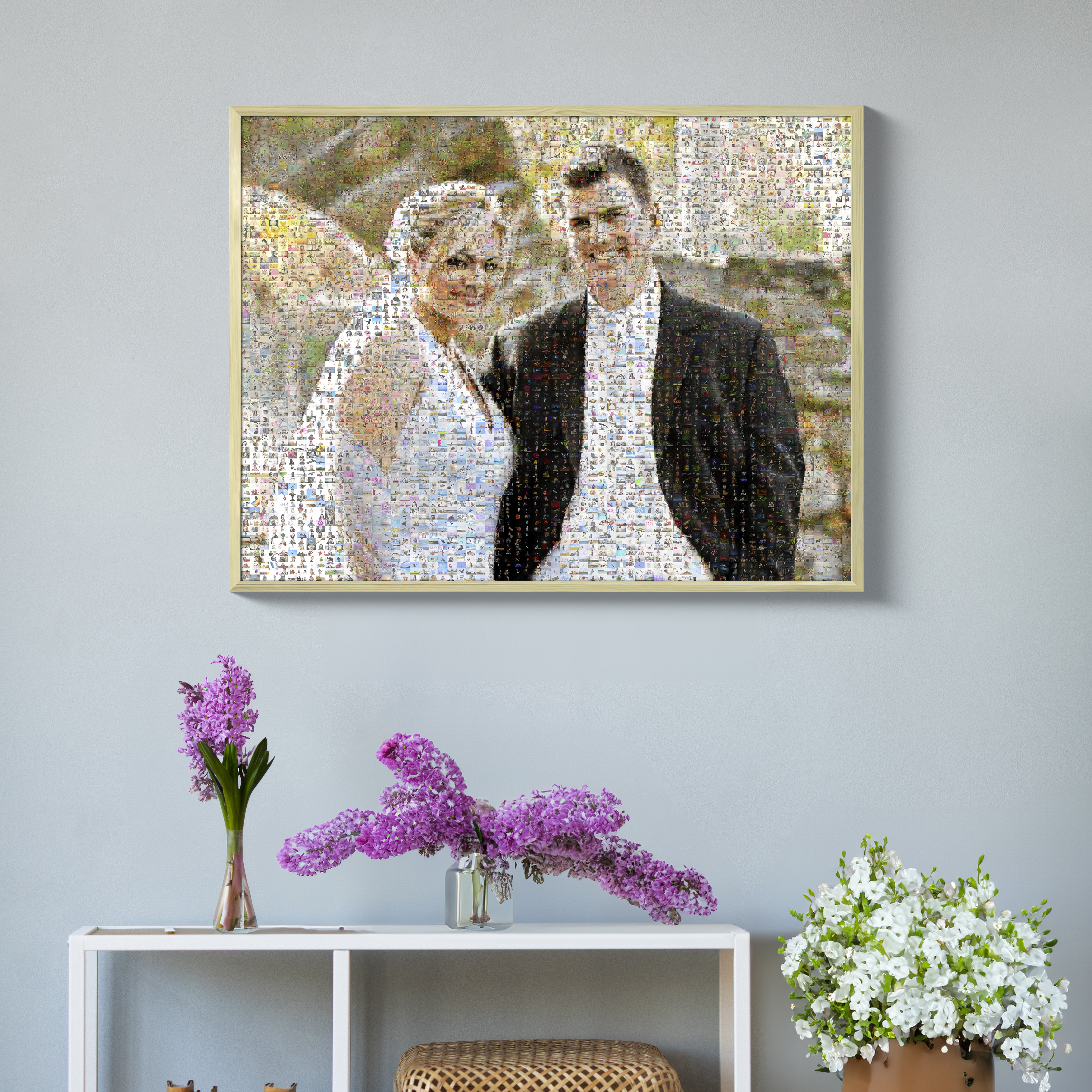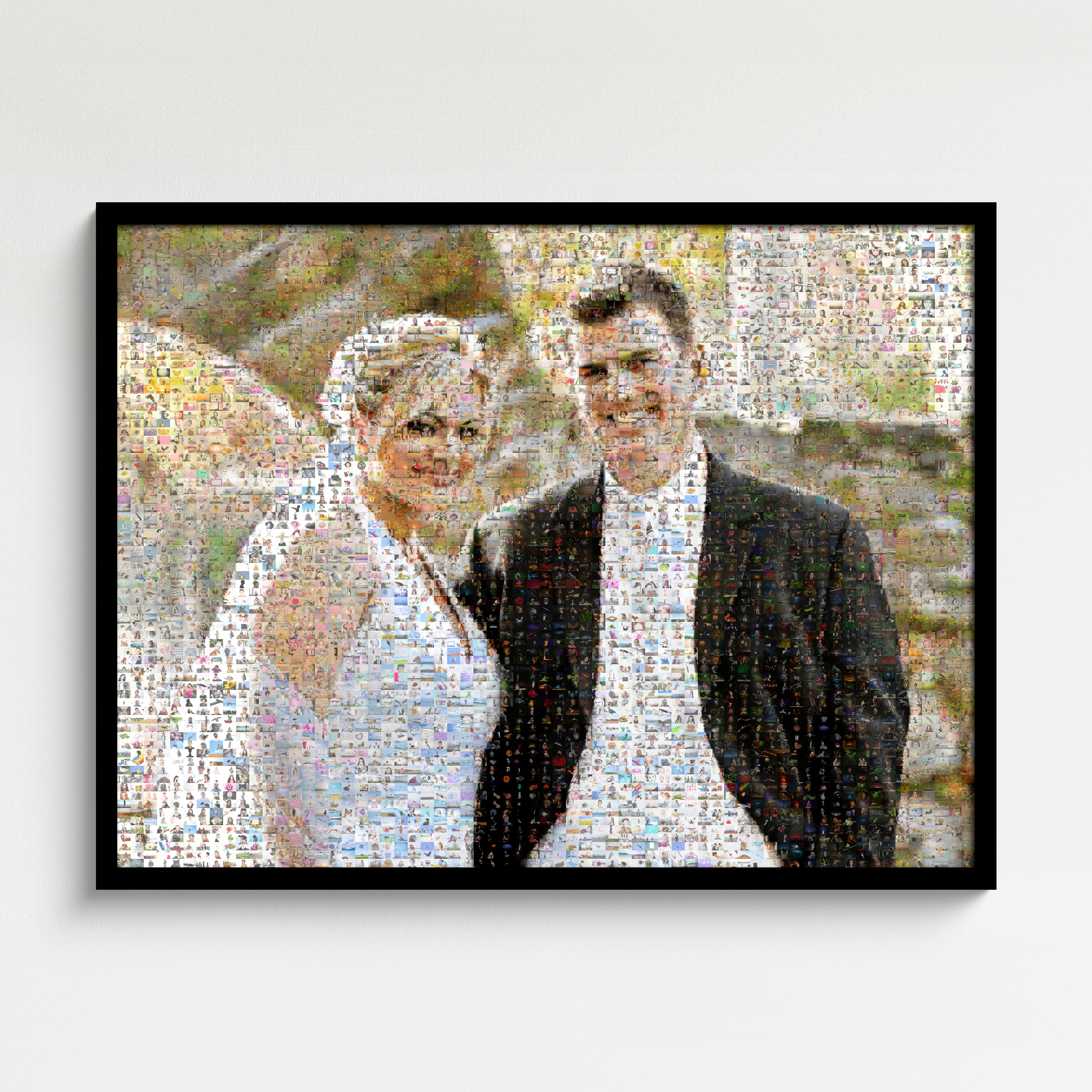 Individueel fotomosaïek als uniek huwelijkscadeau samengesteld uit kleine foto's.