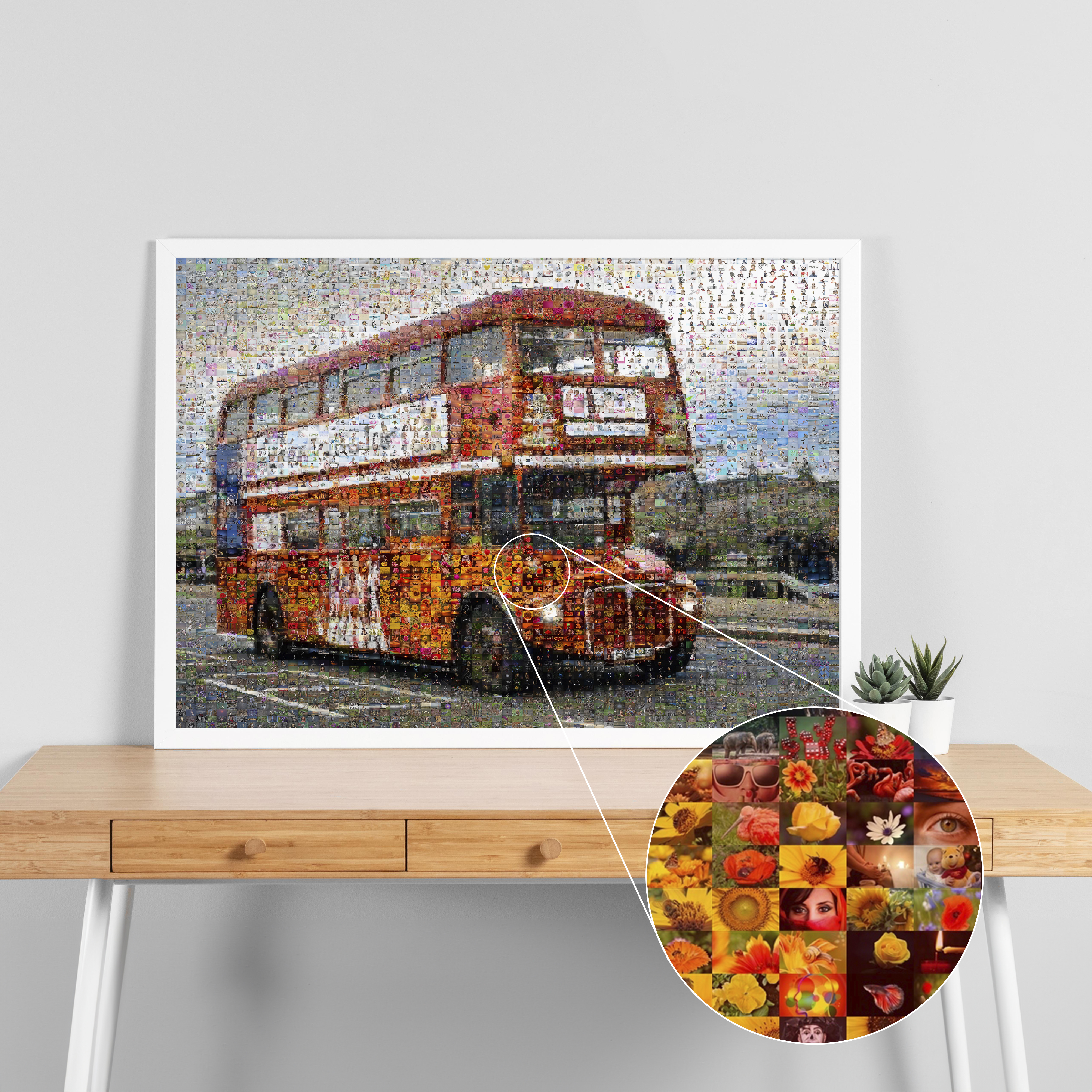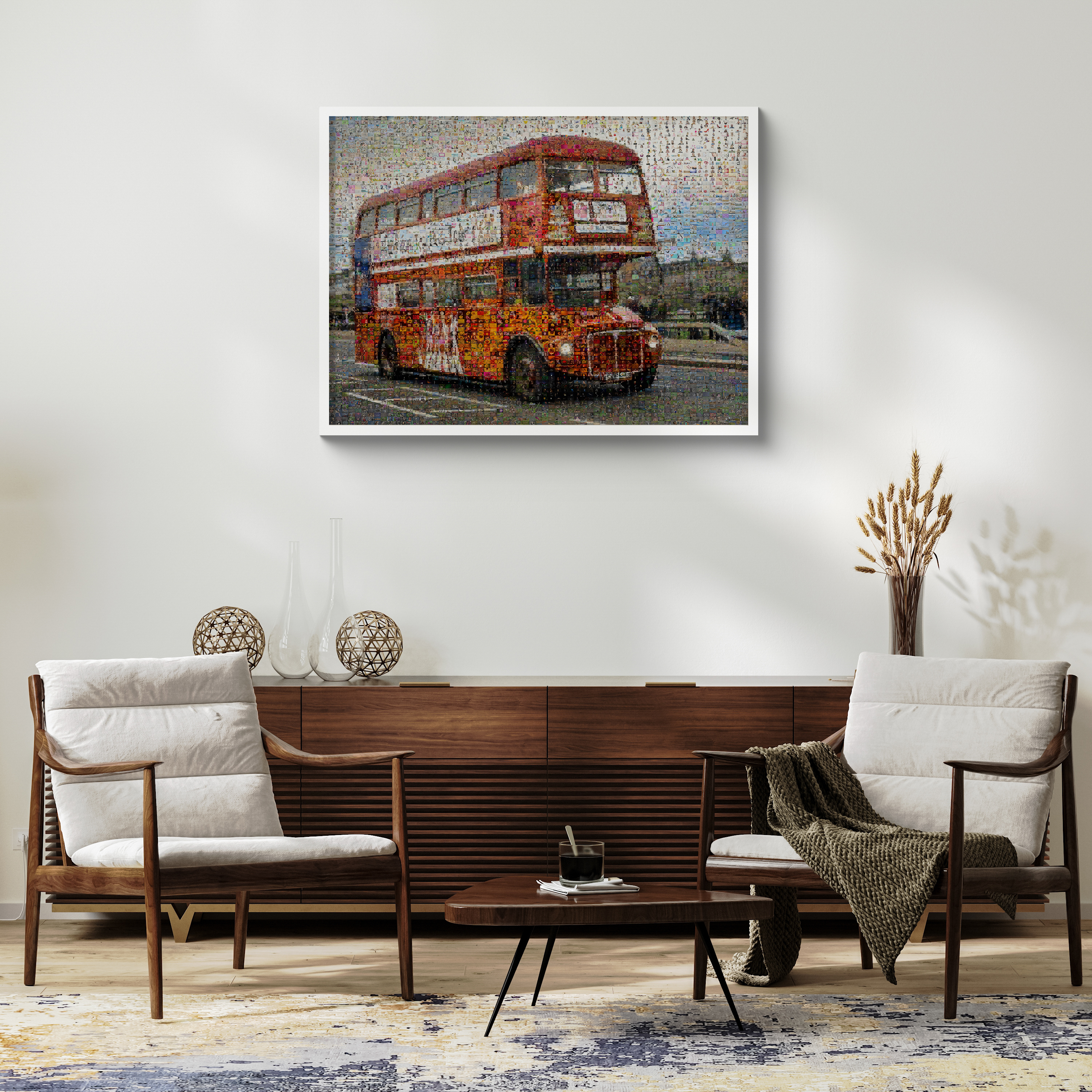 Een uniek fotomozaïek van een Londense bus, perfect voor reisfans en als stijlvol cadeau.