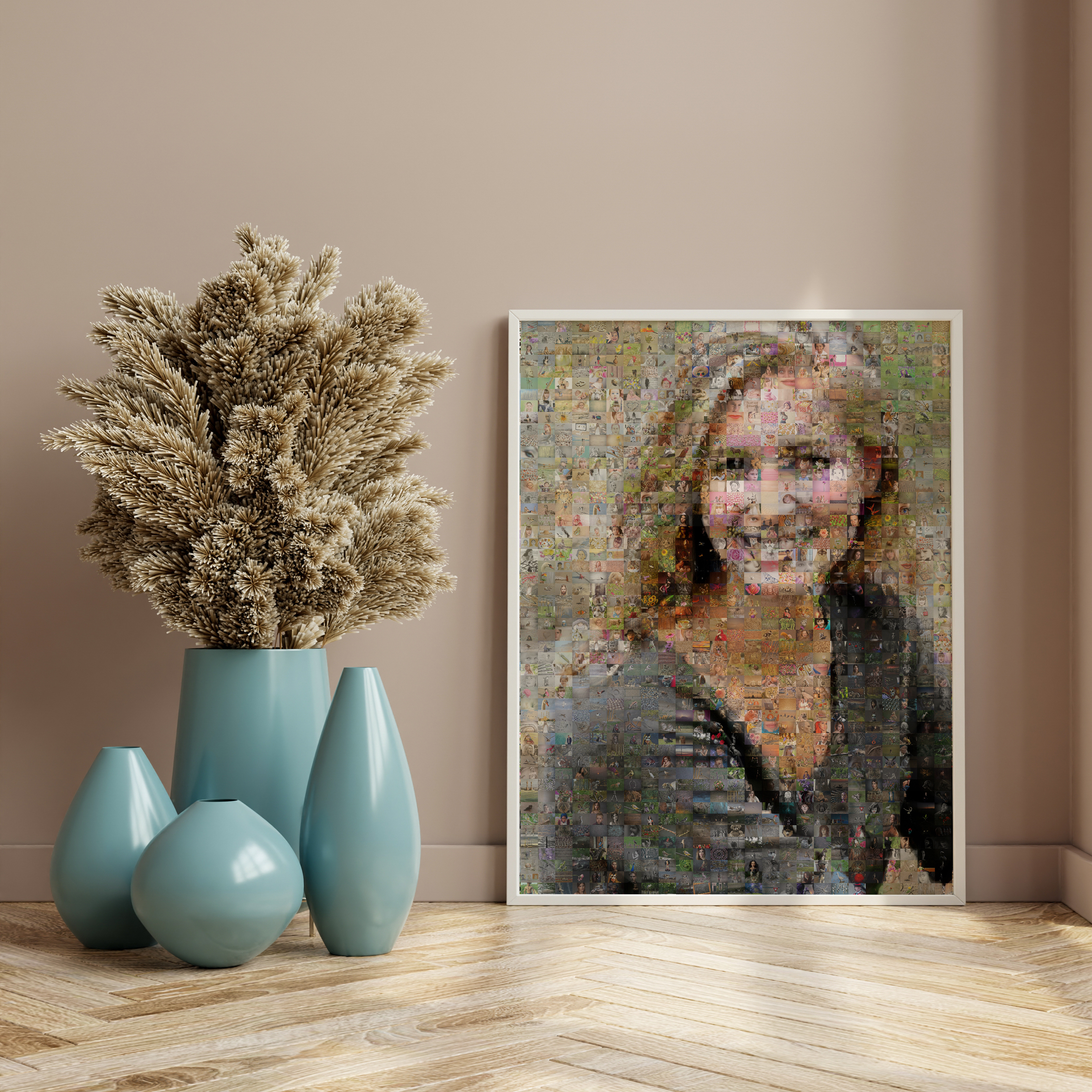 Maak je eigen unieke fotomosaïek en creëer een bijzonder kunstwerk uit je dierbare herinneringen. Dit fotomosaïek, waarin een prachtig portret van een vrouw tot leven komt door honderden kleine foto's, biedt een onvergetelijk eerbetoon aan speciale momenten en is een ideaal cadeau voor ieder feestelijke gelegenheid. Perfect om je huis een persoonlijk tintje te geven.